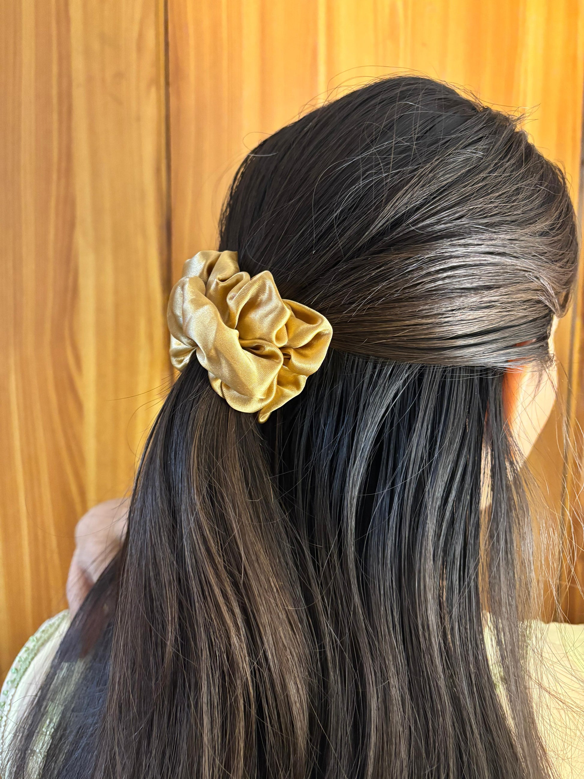 - Gold satin scrunchie โ Elegant satin scrunchie in a rich gold tone.