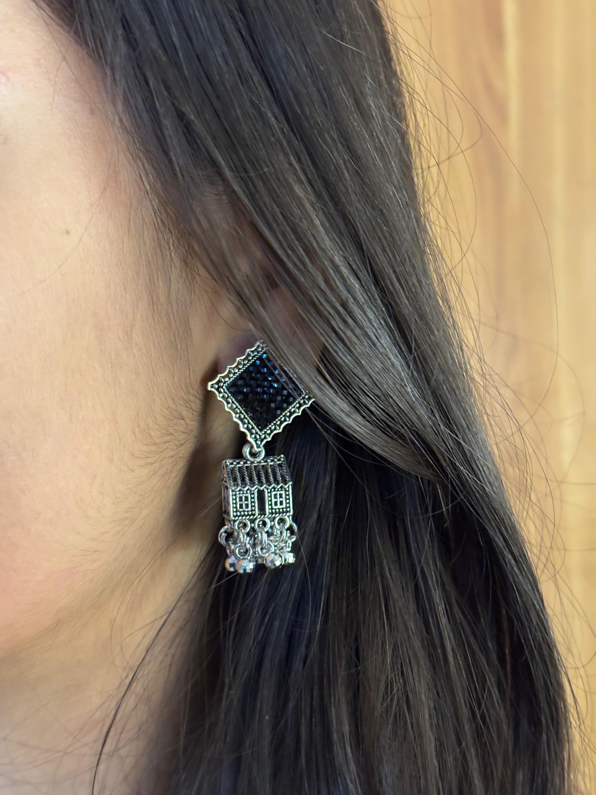 - Silver square & chain jhumka earrings โ Square stone stud with chain-linked mini jhumkas and oxidised detailing.